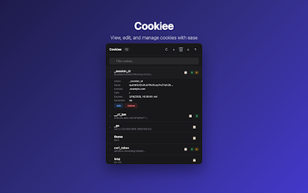 Cookiee — это расширение для Chrome, предназначенное для управления куками браузера без усилий. Этот бесплатный инструмент позволяет пользователям просматривать, редактировать, добавлять, удалять, экспортировать и импортировать куки для любого веб-сайта, что делает его универсальным выбором для тех, кто требует детального управления куками. С такими функциями, как копирование в один клик и возможность поиска или фильтрации куков, пользователи могут легко ориентироваться в своих данных о куках.